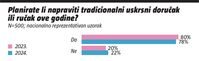 U usporedbi s prošlom godinom tek je nešto manje onih koji planiraju raditi tradicionalni uskrsni doručak ili ručak. Naime, sada to planira 78 posto građana, dok ih je lani bilo 80 posto. Nije to neka razlika, ali vrijedi spomena.