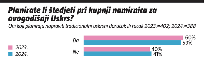 Kada je riječ o tome planiraju li štedjeti pri kupnji namirnica za ovogodišnji Uskrs nije bilo nekih promjena u odnosu na lani jer na ovo pitanje potvrdno odgovara tri od pet građana. Naime, ove godine udio onih koji planiraju štedjeti iznosio je 59%, a lani 60%.
