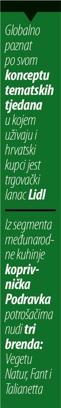 Porast zanimanja za okuse međunarodne kuhinje zadnjih nekoliko godina primijetili su i u koprivničkoj Podravki pa nastoje što više udovoljiti potrošačima koji su željni novih koncepata, proizvoda i okusa. Kako navode, potrošači traže praktične i jednostavne proizvode koji će im omogućiti brzu pripremu ukusnih i egzotičnih jela te inspirirati njihova nova kulinarska iskustva. Također svjedoče trendu proširenja internacionalnih polica u retailu, što dodatno dokazuje rastući interes potrošača, te poručuju kako Podravka u svom asortimanu nudi proizvode iz segmenta međunarodne kuhinje pod tri brenda: Vegeta Natur, Fant i Talianetta.