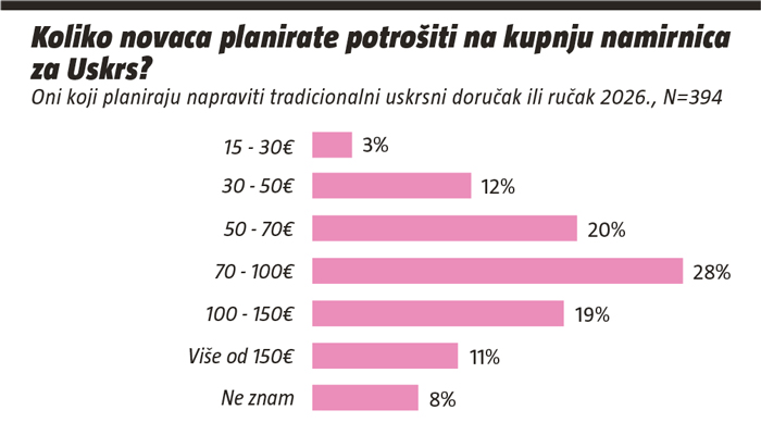Zanimalo nas je i koliko novaca planiraju potrošiti za kupnju namirnica za Uskrs. Najveći broj njih, 28%, planira potrošiti od 70 do 100 eura. Potom dolaze oni koji će potrošiti od 50 do 70 eura, njih ima 20%, a slično tome, točnije 19%, ima i onih koji će potrošiti nešto veće iznose od 100 do 150 eura. Više od 150 eura potrošit će 11% građana, a male iznose od 30 do 50 eura izdvojit će 12% građana.