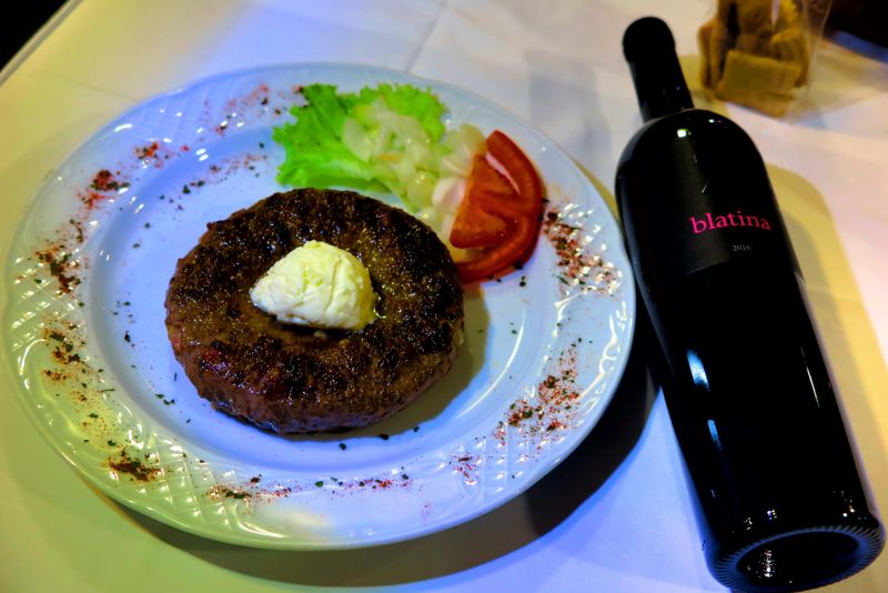 Nakon toga, uzvanici su morali odložiti dotad glavno oružje – žlicu – i uhvatiti se vilice i noža, jer je na stol došao prvi specijalitet s roštilja – đevrek s kajmakom i lukom. Ovaj pošteno velik komad mljevenog mesa, nazivaju i pljeskavicom s rupom, u koju se dodaje kugla punomasnog kajmaka na vrhu. Blatina Keža iz 2016. godine svojim se intenzitetom, ali i pitkošću, nekako uspjela izboriti s ovim moćnim jelom.