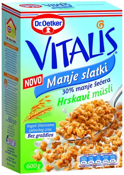 Dr. Oetker se sa svojim Vitalis brendom usko fokusirao na muesli vrhunske kvalitete i recepture koje su rezultat vrlo zahtjevnih proizvođačkih tehnologija kako bi se postigla unikatna kvaliteta obrađenih žitarica.