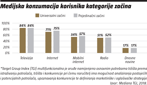 Što se tiče medijske konzumacije na dnevnoj bazi nema razlika između korisnika u ove dvije kategorije. Podaci su dostupni za sve vrste medija, a mi ćemo ovdje prikazati udio gledatelja televizije, interneta, mobilnog interneta, radija, te dnevnih novina. Na prvom je mjestu konzumacija televizije – oko 84% korisnika univerzalnih i pojedinačnih začina konzumira televiziju na dnevnoj bazi. Na drugom je mjestu internet, a potom slijede mobilni internet, radio i dnevne novine.