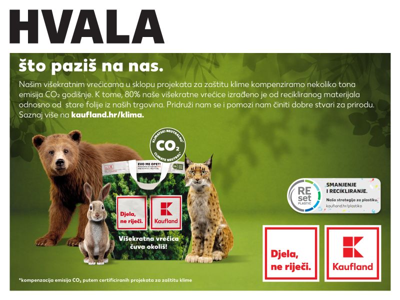 Valja podsjetiti da je Kaufland prvi trgovački lanac u Hrvatskoj koji je ukinuo plastične vrećice na blagajnama,a u borbi za zaštitu klime sada idu i korak dalje pružajući održiva alternativna rješenja – pridružite se i Vi kupovinom nove višekratne vrećice koja u sastavu ima 80% reciklirane folije iz trgovina Kauflanda i odgovorne vrećice za voće i povrće.