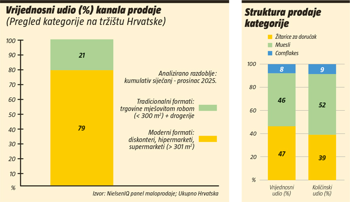 Što se tiče aspekta mjesta prodaje, čak 78,9% ukupne vrijednosne prodaje kategorije žitarica za doručak u 2025. godini ostvareno je kroz moderne formate (hipermarkete, supermarkete i diskontere). Preostalih 21,1% prodaje realizirano je kroz tradicionalne formate koji uključuju trgovine mješovitom robom do 300 m2 i drogerije.