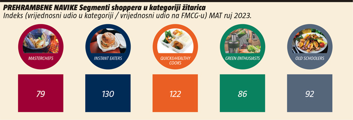 Instant Eaters i Quick&Healthy shopperi kreiraju najveću relativnu vrijednost u žitaricama – ova dva segmenta stvaraju 35% vrijednosti FMCG-a, dok je njihov doprinos vrijednosti kategorije žitarica 44%.