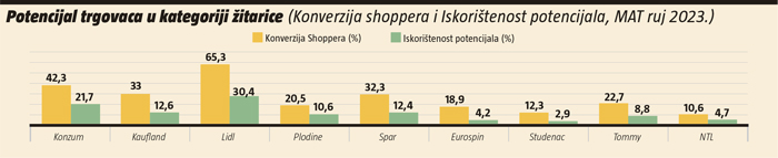 Konzum, Spar i Plodine također imaju veći VPE u žitaricama u odnosu na svoj VPE na FMCG-u, dok Tommy, Studenac i KTC imaju najveći relativni neiskorišteni potencijal. Lidl konvertira čak 65% svojih shoppera u shoppere žitarica, slijedi Konzum s 42%, Kaufland s 33% itd.