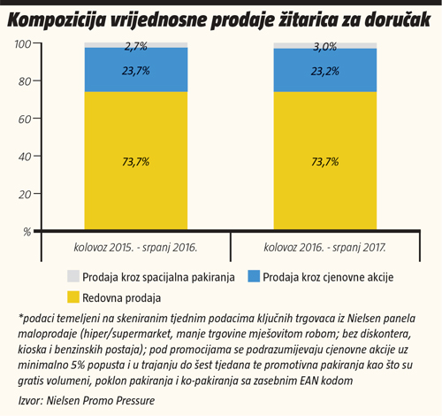 kroz promocije je neznatno pala za 0,7% i to najvećim dijelom zbog pada prodaje kroz cjenovne akcije od oko 2,3%. Međutim, pad promotivne prodaje ublažio je veliki rast prodaje specijalnih pakiranja od čak 13% vrijednosno i 20% količinski, ali ne dovoljno da donese dodatnu vrijednost ili nove kupce cijeloj kategoriji. Ipak, ukupan odnos promotivne i redovne prodaje ostao je približno isti u periodu od kolovoza 2016. do srpnja 2017. u odnosu na isti period godinu ranije, gdje je po redovnim cijenama prodano 73,7% žitarica, kroz akcijsku prodaju 23,2%, dok je prodaja specijalnih i gratis pakiranja iznosila nešto više nego prethodnog perioda, 3%.