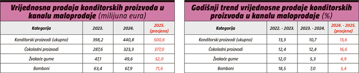 Prema tvrtki za analizu podataka Euromonitor International, očekuje se da će maloprodaja čokoladnih slastica u Hrvatskoj značajno porasti u vrijednosnom pogledu u 2025. godini. To je uglavnom zbog povećanja cijena, potaknutog globalnom nestašicom kakaa i rastućim troškovima proizvodnje. Kakao, ključna sirovina, dosegao je rekordno visoke cijene početkom 2025., potaknut lošim žetvama u glavnim zemljama proizvođačima poput Obale Slonovače i Gane. Tržište također ima koristi od kontinuirane potražnje za luksuznim i premium formatima čokolade, posebno tijekom sezonskih razdoblja i za prigode darivanja.